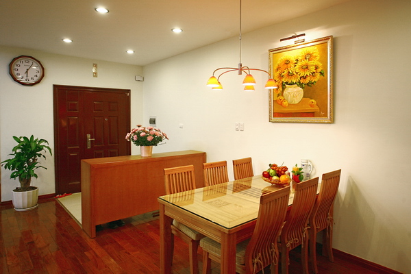 – Hình dáng và kích thước bàn: Phổ biến nhất là dạng bàn hình chữ nhật, tiếp theo là bàn vuông và bàn tròn. Ngoài ra còn một số kiểu bàn khác như hình bầu dục, bàn dài kiểu chữ nhật nhưng cạnh ngắn vuốt cong hoặc bán nguyệt… Cần căn cứ vào vị trí đặt bàn ăn, diện tích và các hướng tiếp cận xung quanh để lựa chọn hình dáng phù hợp. Các bàn chữ nhật dùng cho gia đình thường có tỷ lệ cạnh xấp xỉ 1:2, với chiều rộng khoảng 70cm – 90cm, chiều dài khoảng 140cm – 200cm. Bàn chữ nhật bố trí ghế đối xứng 2 phía cạnh dài, và có thể có ghế ở cạnh ngắn. Với kích thước như trên, thì bàn chữ nhật thường có 4 – 10 ghế, (phụ thuộc vào cả kích thước ghế và cấu trúc chân bàn). Bàn vuông thông thường chỉ đặt được 4 ghế, còn bàn tròn lại rất linh hoạt trong việc xếp ghế, sử dụng hiệu quả cho diện tích nhỏ. Một chiếc bàn tròn có đường kính 1m (diện tích sẽ nhỏ hơn bàn vuông cạnh 90cm) nhưng lại có thể ngồi được 6 người, trong khi bàn vuông với kích thước đó chỉ ngồi được 4 người. Bàn vuông, bàn tròn nên được kê ở trung tâm, có lối giao thông xung quanh thuận tiện; còn bàn chữ nhật có thể kê áp một cạnh ngắn vào tường. Hiện nay trên thị trường có một số loại bàn mặt cơ động, có thể mở rộng kích thước khi cần thiết (cùng với việc bổ sung ghế) khá linh hoạt và tiện dụng.
