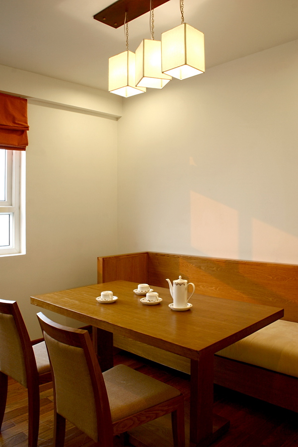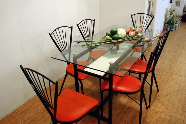 Bàn ăn kết hợp chất liệu gỗ và kính. Mặt kính ở đây không có tác dụng chịu lực mà mang ý nghĩa vệ sinh.