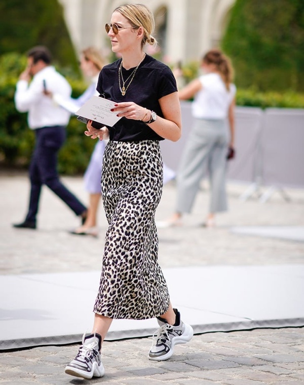 Để tạo cho mình một phong cách thoải mái nhưng gợi cảm, bạn hoàn toàn có thể kết hợp ba món đồ sau: Áo phông đen, chân váy da báo và sneakers.