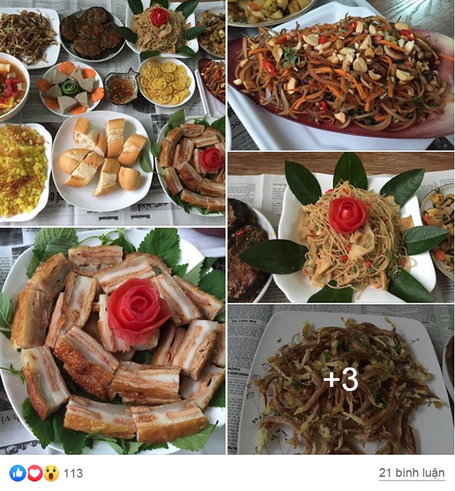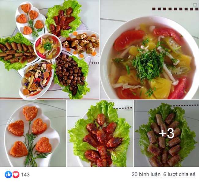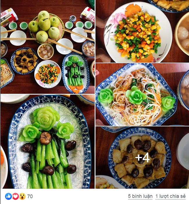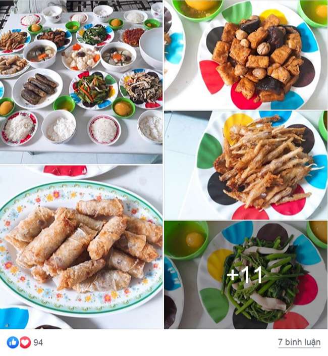 Không kém cạnh những chị em khác, chị Nguyễn Thanh Thúy cũng góp vui với mâm mâm chay nhà mình. Nhìn nguyên một bàn đồ ăn như vậy cũng đủ thấy chị Thúy đã vất vả nấu nướng như thế nào. Các món ăn của nhà chị không có gì khác biệt so với mọi người, tất cả đều là những món chay quen thuộc, rất ngon và dễ làm.