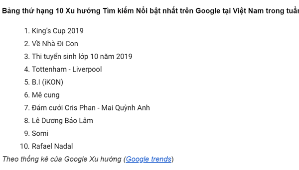 Cạnh đó, trận chung kết giải đấu giao hữu King’s Cup 2019 diễn ra giữa đội tuyển Việt Nam và đội tuyển Curacao dẫn đầu xu hướng tìm kiếm trên Google tuần qua. Dù gỡ hòa ở phút 83 với bàn thắng xuất sắc của Đức Huy, đội tuyển Việt Nam vẫn thua đáng tiếc với tỷ số 4-5 ở loạt luân lưu. Tuy hụt chức vô địch nhưng thành tích ở giải đấu lần này đã giúp đội tuyển Việt Nam tăng lên hạng 97 trên bảng xếp hạng FIFA và lọt top 15 đội tuyển mạnh nhất Châu Á.
