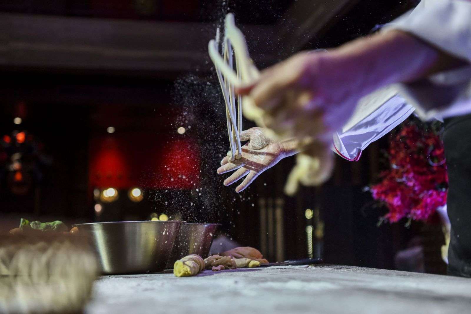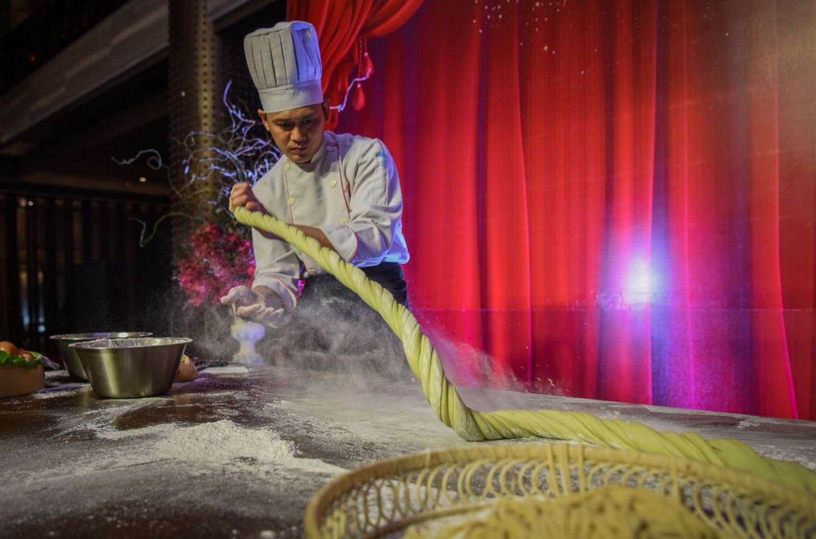 Khởi đầu là màn trình diễn kéo mì sợi. Mì sợi được xem là một nghệ thuật ẩm thực đặc trưng bậc nhất của người Hoa. Làm mì sợi theo cách truyền thống là cả một nghệ thuật. Bột được kéo dài ra và xoắn tít trên không trung.