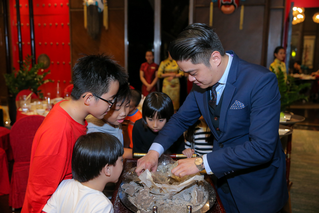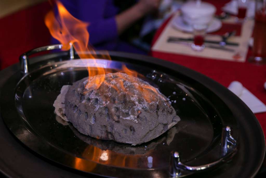 Màn “đập gà” thu hút được nhiều sự quan tâm nhất. Gà vẫn bốc khói và thơm nức sau khi được lấy ra từ lớp muối biển.