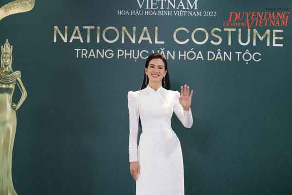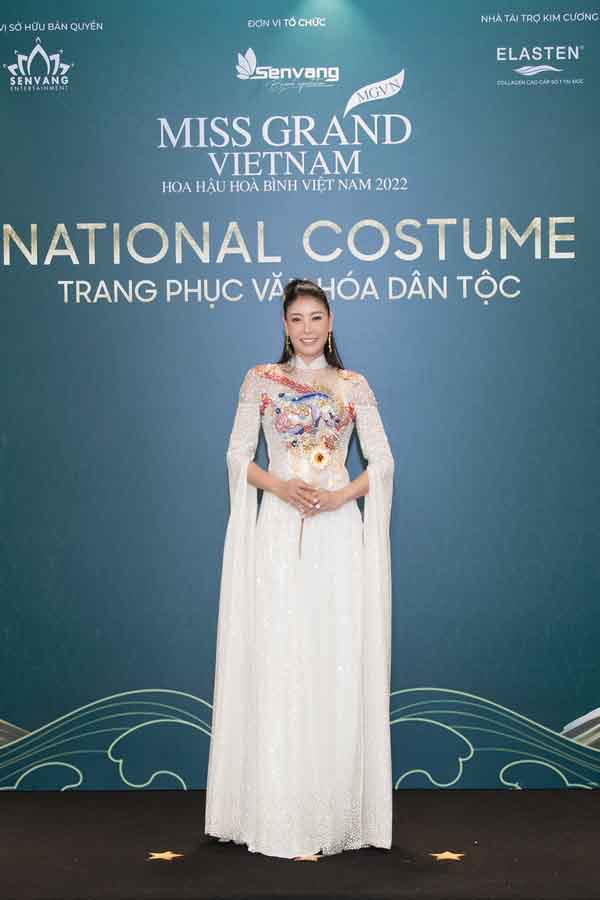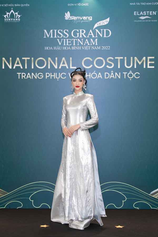 Á hậu Hà Kiều Loan trong trang phục áo dài truyền thống được làm từ chất liệu phi bóng đã giúp cô tỏa sáng trên thảm đỏ National Costume – Miss Grand Vietnam 2022.