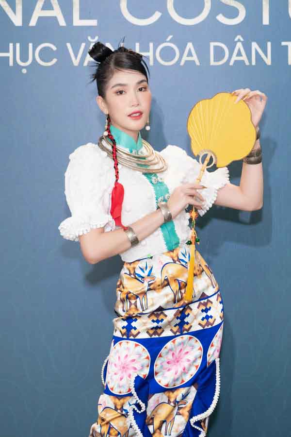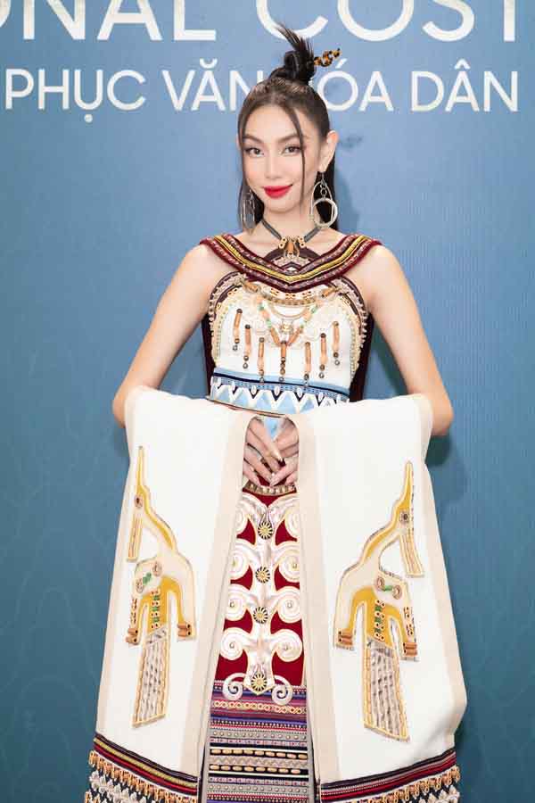 Hoa hậu Hòa Bình Quốc tế Thùy Tiên xuất hiện lộng lẫy với trang phục họa tiết thổ cẩm, mang đậm nét truyền thống của Việt Nam. Nhanh chóng, nàng hậu sinh năm 1998 trở thành tâm điểm chú ý của khán giả hâm mộ.