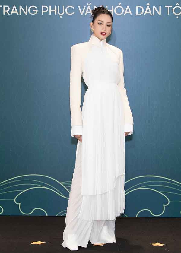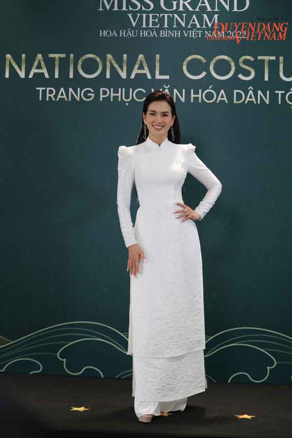 Khoác trên người trang phục áo dài trắng truyền thống thế nhưng siêu mẫu Anh Thư lại trông vô cùng nổi bật với thiết kế vô cùng hiện đại. Với phần vai được thiết kế phồng nhẹ cho thấy vẻ đẹp nhẹ nhàng nhưng toát ra vẻ rất quyền lực của một phụ nữ. Song, ở phần tà áo được cắt xẻ thành 2 tầng vô cùng độc đáo, phụ kiện khuyên tai cũng giúp nữ giám khảo Miss Grand Vietnam 2022 trông thật nổi bật và cuốn hút.