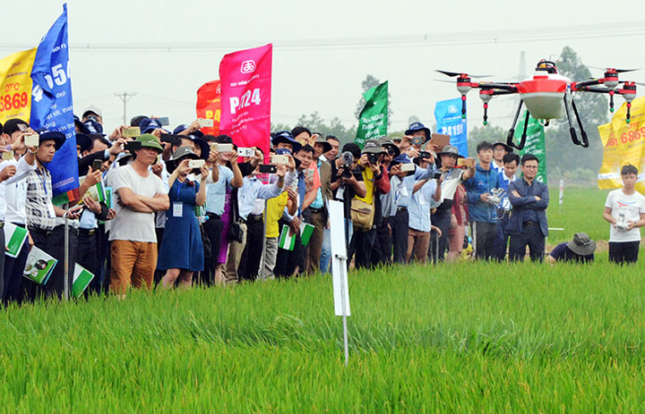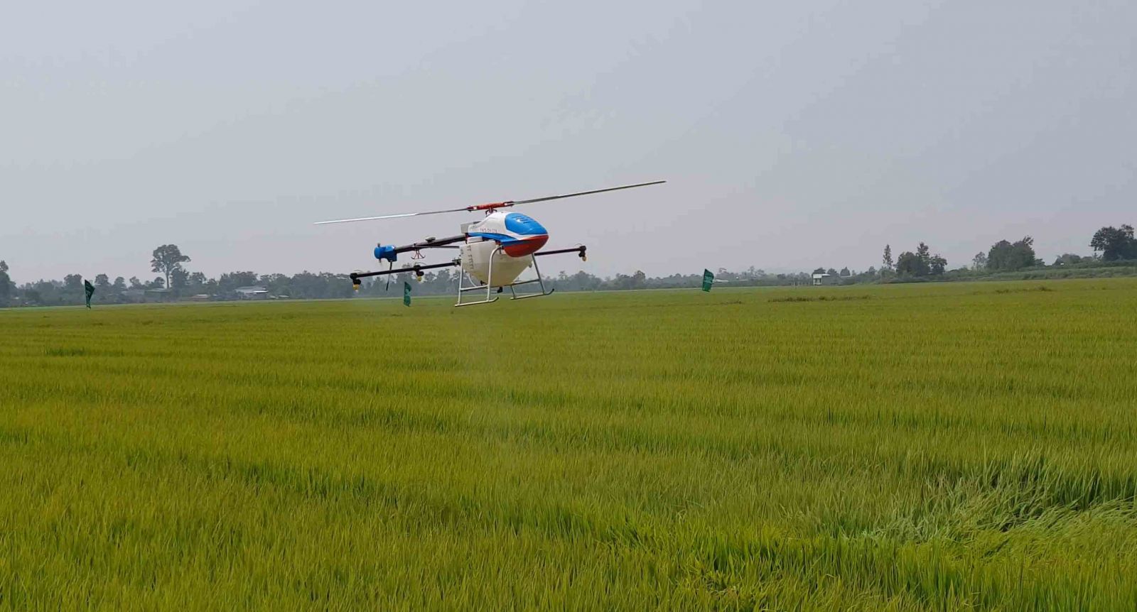 Người dân thôn Phú Hòa, huyện Lương Tài (Bắc Ninh) lần đầu tiên trông thấy những chiếc máy bay không người lái thay họ phun thuốc bảo vệ thực vật cho hàng chục hecta lúa. Mỗi chiếc máy bay có thể phun kín 2ha lúa chỉ trong 10 phút với 17 lít thuốc. Đây là một giải pháp khiến bà con rất hào hứng.