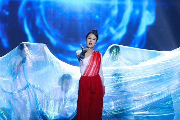 Vén màn giữa màu sắc không gian tối tăm và u ám bởi sự “gầm rú” của thiên nhiên, Anh Thi khiến khán giả không thể rời mắt với “Vượt lên dòng nước”. Từng bị nhấn chìm bởi dòng nước, từng sống trong sợ hãi lớn của cuộc đời, cô nàng đã tái hiện lại những ký ức của thời quá khứ, cho người xem cảm nhận được sự bất lực trước những gì đã từng trải qua.