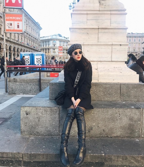 Nếu những bộ cánh sáng màu mang lại cho Baifern vẻ dịu dàng, yêu kiều thì set đồ đen ton sur ton này lại khiến cô trông vô cùng sang chảnh, thời thượng.