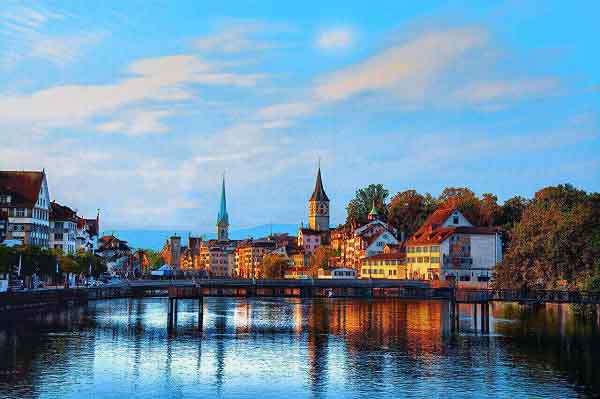 Nằm soi bóng bên dòng sông Limmats, thành phố Zurich được bao quanh bằng những hồ nước tuyệt đẹp, đồi núi trập trùng và những cánh rừng rậm tuyệt đẹp trải dài theo sườn núi từ tây sang đông. Bước vào tháng 10, Zurich sáng bừng lên vì cây thay màu lá, chiếm lĩnh tâm trí bạn bằng những gam sắc rực rỡ nhất, từ những chiếc lá màu cam ấm áp trong những khu rừng tĩnh lặng cho đến những chùm lá đỏ tươi của cây việt quất lấp ló sau hàng rào của một khu vườn nhỏ bé nào đó. Kiến trúc Zurich khá đặc biệt. Cả thành phố, ngoài nhà thờ và một số ít các cao ốc văn phòng, hầu hết các công trình kiến trúc ở đây đều không quá 5 tầng. Các ngôi nhà đứng sát bên nhau thành tầng tầng lớp lớp trông gọn gàng và đẹp như hình chụp bưu thiếp. Ở đây, bạn dễ dàng bắt gặp những con đường lát đá xanh nho nhỏ đã có tuổi đời vài trăm năm, các công trình kiến trúc xây từ thời Trung Cổ. Dạo chơi phố cổ Altstadt, thăm nhà thờ Fraumünster và ngắm những đàn thiên nga trắng muốt bơi lội trên mặt hồ Zurich đẹp mê hồn là những trải nghiệm không thể bỏ lỡ ở Zurich.