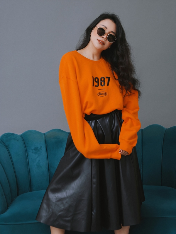 Ở bộ 1, Trà Ngọc Hằng diện áo cam tay dài phối với váy da đen, vừa tạo sự nữ tính dịu dàng nhưng cũng không kém phần cá tính cho người mặc.