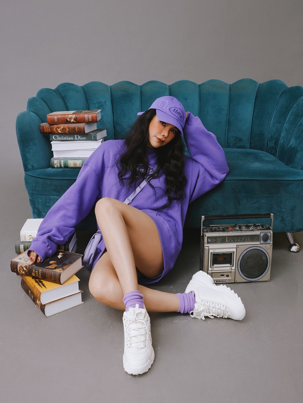 Trong bộ 2, người đẹp lăng xê gam màu tím khi diện set đồ gồm áo dạng hoodie với nón. Set đồ phù hợp để diện trong những chuyến đi chơi chào hè.