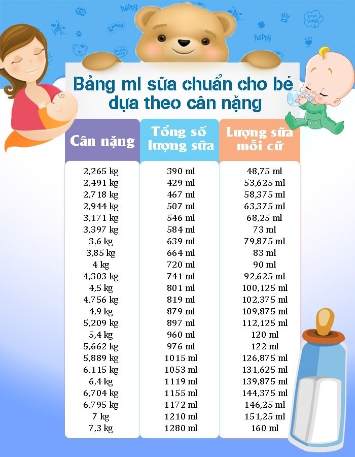 Tuy nhiên, tùy vào cân nặng và sự phát triển của bé mà mẹ có thể tham khảo cho bé bú theo bảng ml sữa dưới đây.
