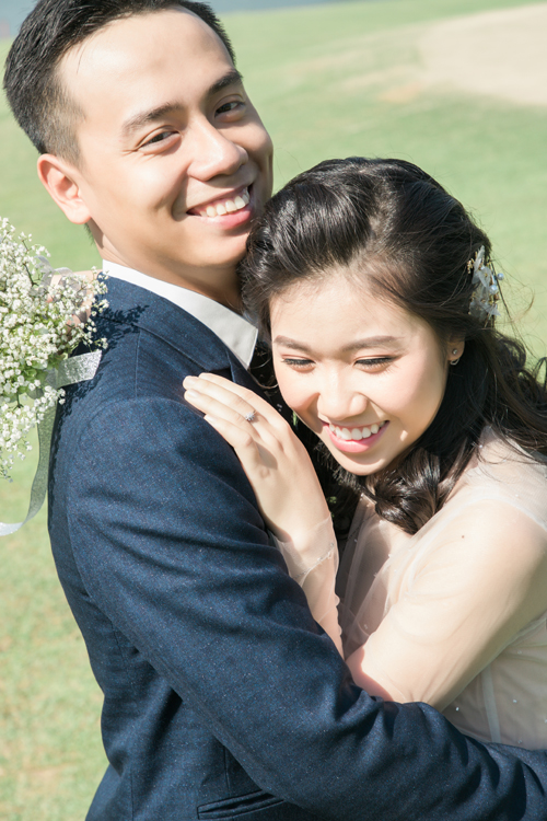 Cô dâu có thể ôm lấy chú rể và hướng mắt xuống dưới để không bị nheo mắt. Một cách khác mà các cặp uyên ương thường áp dụng là hôn nhau, giúp đôi mắt nghỉ ngơi và tạo nên khoảnh khắc tình cảm trong album ảnh cưới.