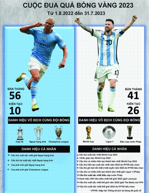 Haaland đã ghi tổng cộng 56 bàn (tính luôn ở đội tuyển Na Uy) và có 10 kiến tạo. Messi tổng cộng mùa giải ghi 41 bàn và 26 kiến tạo (tính luôn ở đội tuyển). Điểm trừ của Haaland là anh không có thành tích nào nổi bật với đội tuyển Na Uy, do bị loại ở vòng loại World Cup 2022. “Đây sẽ là cuộc đua hết sức lý thú. Những người bỏ phiếu sẽ rất đau đầu. Thật khó đoán được ai đang thắng thế. Chỉ có Messi hoặc Haaland đoạt danh hiệu này, những cầu thủ khác kể cả Mbappe sẽ rất khó cạnh tranh”, tờ AS (Tây Ban Nha) nhận định.
