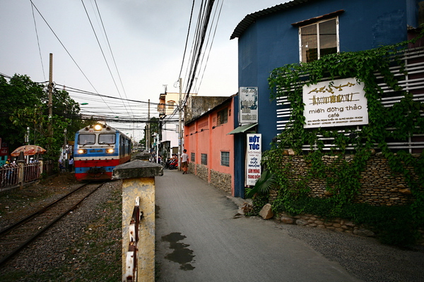 Cuối cùng thì cũng tới nơi, đường nho nhỏ, mà lại quẹo vào ngõ – cũng nho nhỏ. Bên ngoài có tấm biển nhỏ ghi chữ “Miền đồng thảo café” dưới hình một đường ray cách điệu. Cuối buổi chiều trời Sài Gòn xâm xẩm, loáng thoáng những ánh đèn. Điều làm tôi bất ngờ đầu tiên là quán nằm kế bên đường ray xe lửa, tự nhiên gợi nhắc trong tôi về một quán café sinh viên có tên “Sân ga” ở Hà Nội vời vợi thủa nào.