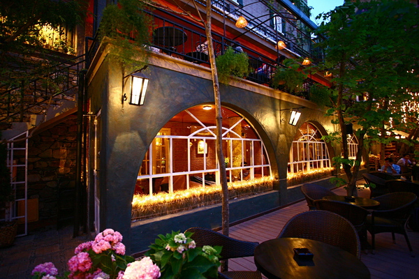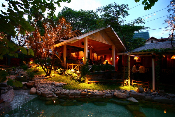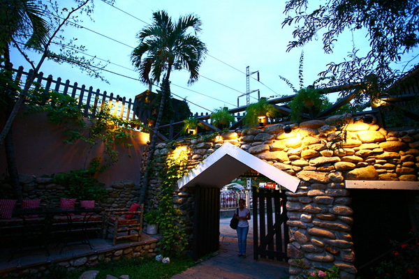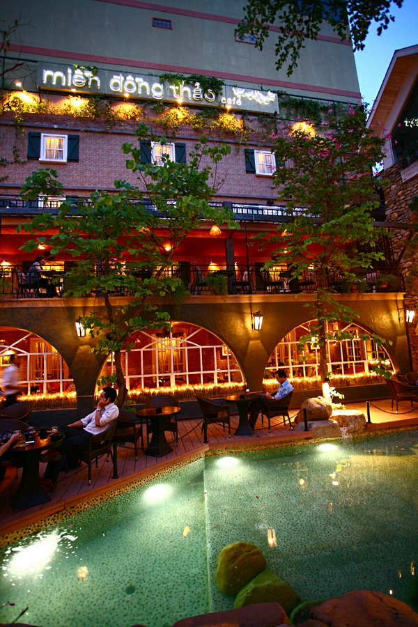 Bước qua cổng, tôi tiếp tục bất ngờ vì không nghĩ nó lại lớn thế này. (Ở Hà Nội hình như không có quán cà phê nào lớn thế?) Một không gian “sạch” mở ra đầy ấn tượng và quyến rũ (ít ra là đối với riêng tôi). Cây xanh, thảm cỏ, mặt nước, những bông hoa đang nở, những vật liệu thô mộc… làm tôi thoải mái. Ngồi cà phê, tôi thích chọn chỗ cao nếu có thể để nhìn từ trên xuống… Rồi lẩn thẩn nghĩ: Quy mô của một quán cà phê ngoài việc tính bằng diện tích, bằng đầu tư thì có thể tính bằng… chỗ ngồi không nhỉ?