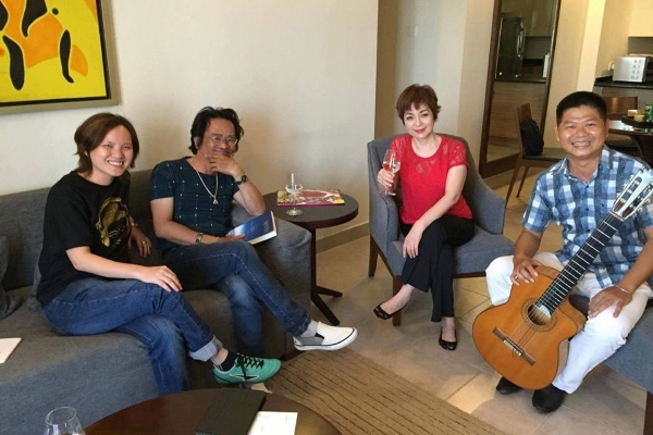 Ca sĩ Ái Vân (áo đỏ), guitarist Bùi Thiên An và nhà báo Quỳnh Như (bìa trái)