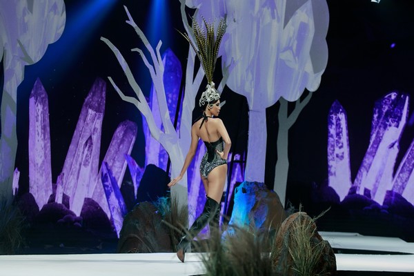Điểm nhấn là bộ cánh nặng 40kg được thực hiện chăm chút và tạo hiệu ứng sân khấu khi có khả năng bắt ánh sáng và manmg lại cảm giác “hào nhoáng”, choáng ngợp khi trình diễn.