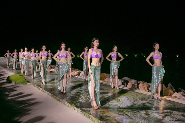 Top 40 thí sinh Miss World Vietnam 2023 trong phần trình diễn trang phục biển đầy ấn tượng.