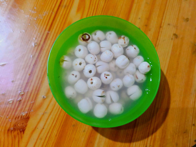 Ngâm hạt sen 8 giờ cho mêm. Nấm tuyết ngâm nở, rửa sạch, xé nhỏ.