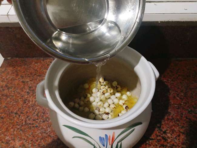 Cho hạt sen, nấm tuyết và nước vào nồi ninh nhỏ lửa cho hạt sen nhừ. Thời gian ninh khoảng 1 giờ.