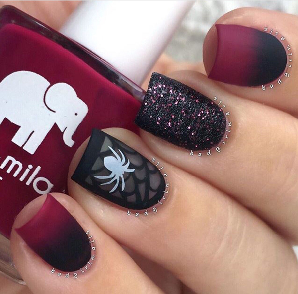 Nêu là cô nàng ‘bánh bèo’, bạn có thể kết hợp mẫu móng sơn ombre với nhũ và một ngón vẽ họa tiết con nhện.
