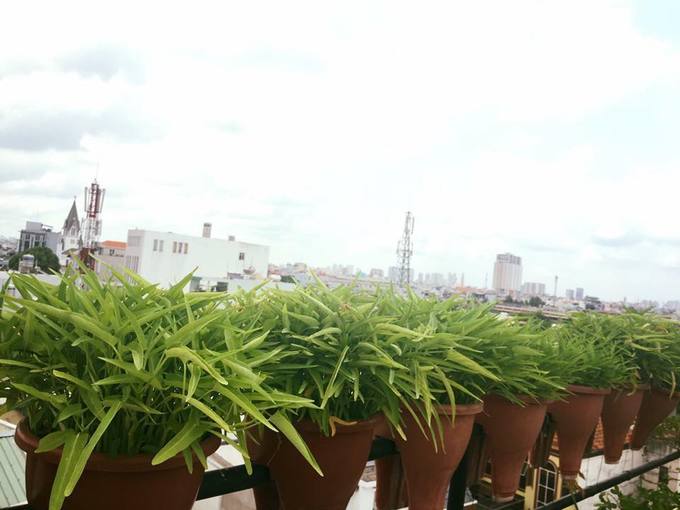 Thành lan can chị dùng chậu kẹo hay loại chậu mốc để trồng những cây rau ngắn ngày cần ít đất.