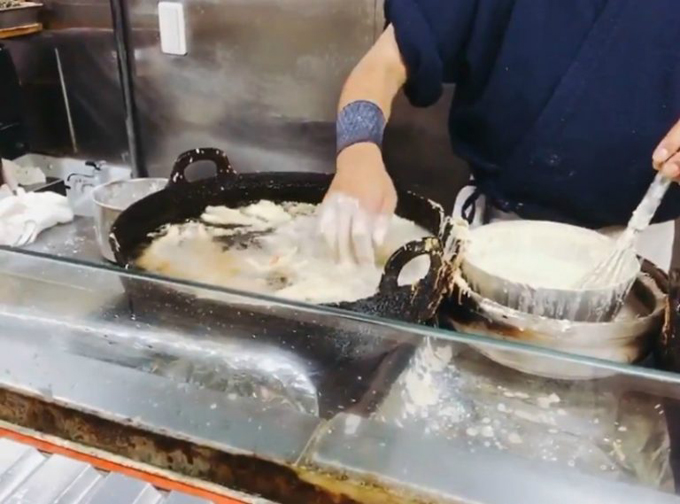 Một đầu bếp Nhật dùng tay không rán bánh trong dầu nóng