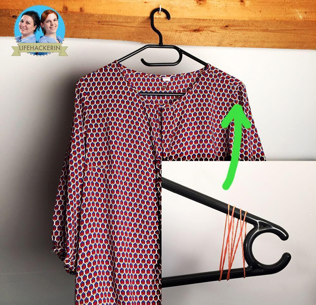 Các nàng chỉ cần buộc chun vào hai đầu của móc như hình, chiếc áo sẽ không bị rơi xuống nữa.