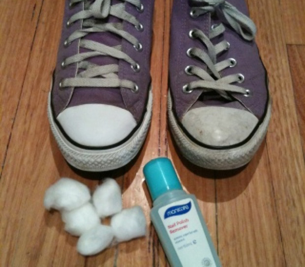 Chỉ cần dùng miếng bông thấm chút nước tẩy móng tay chà lên khu vực cần làm sạch, đôi giày của bạn sẽ sáng lên đáng kể.