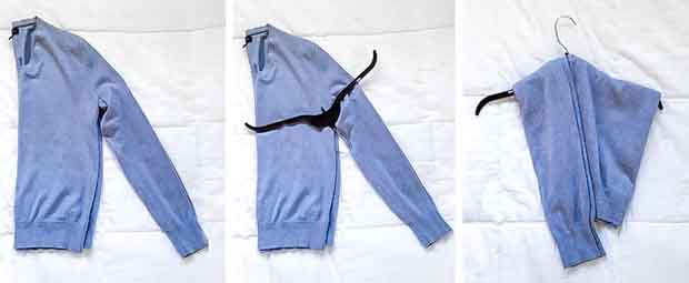 Để trang phục không bị dão và mất form, bạn gập đôi áo, đặt móc vào vị trí nách rồi vắt lên như hình.