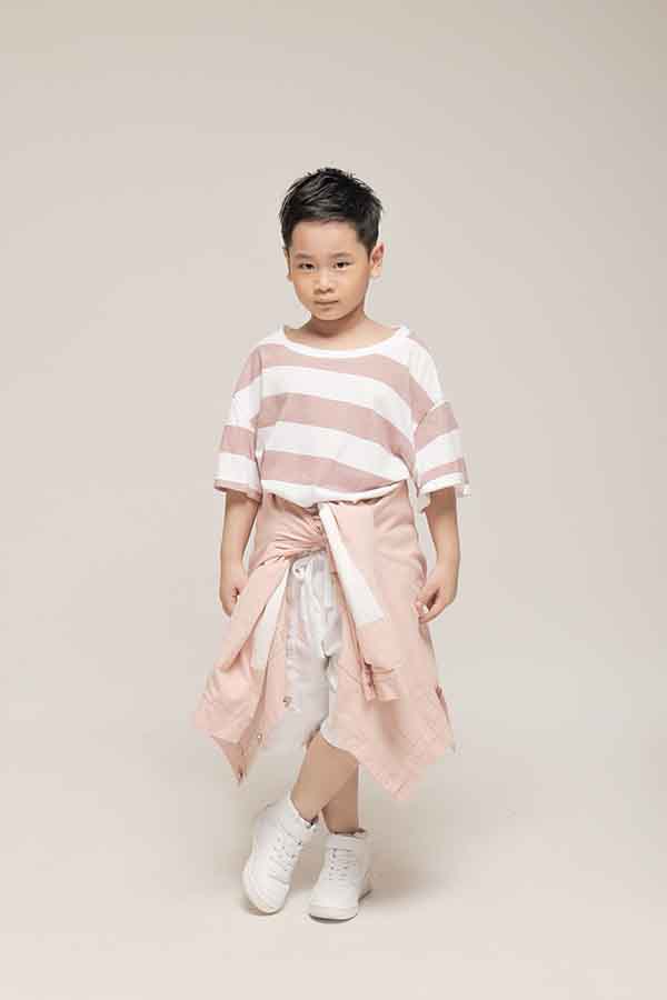 Mốt áo thun xệ vai cũng được đưa vào dòng thời trang trẻ em. Đi đôi với phom dáng áo hot trend là hoạ tiết kẻ sọc ‘ăn khách’.