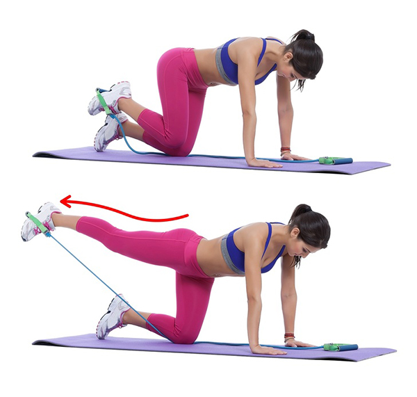Quỳ chống tay trên thảm, lồng chun tập luyện vào hai lòng bàn chân sau đó lần lượt đạp thẳng về phía sau. Lặp lại động tác 10-15 lần mỗi bên.
