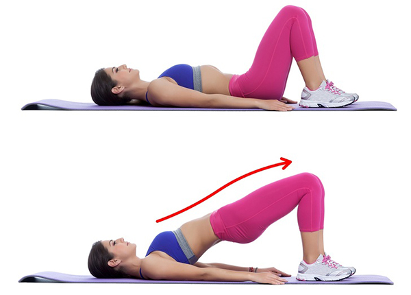 Nằm ngửa trên thảm, hai gối co lại, sau đó hai tay duỗi thẳng, dùng cơ hông, mông nâng người lên cao hết mức. Lặp lại động tác 15 lần.
