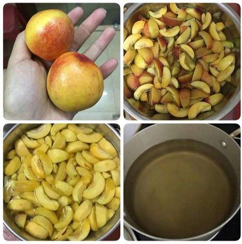 Bước 2: Sau khi gọt đào xong xuôi bạn thắng một chút đường với ít nước cho tới khi đường keo thành màu vàng thì đổ nước và đường vào rồi đun sôi.