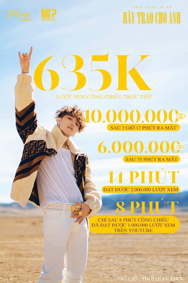 Như vậy, tính đến thời điểm hiện tại, Sơn Tùng M-TP và “Hãy trao cho anh” đã tự thiết lập nên những kỉ lục lịch sử của làng nhạc Việt: đạt 1 triệu views chỉ trong 8 phút, 2 triệu views trong 14 phút, 6 triệu views trong 75 phút, 10 triệu views trong 3 tiếng 17 phút (tính theo thời gian thực tế). Số liệu này là View realtime tại thời điểm hiện tại được METUB ghi nhận, được cập nhật thông qua hệ thống Analytics Realtime của YouTube.