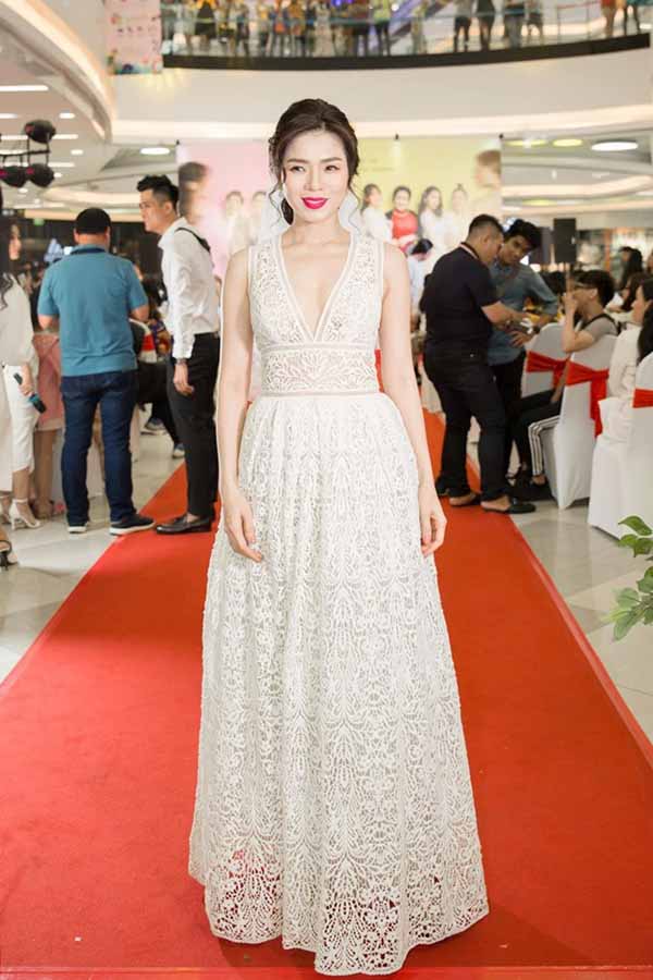 Thúy Diễm giữ vững phong độ thời trang khi chọn váy một vai trắng đầy kiêu sa, được thiết kế hở lưng gợi cảm. Gần đây gia đình Thúy Diễm đắt show quảng cáo nhờ hình ảnh đẹp cùng những nổ lực không ngừn trong nghề.
