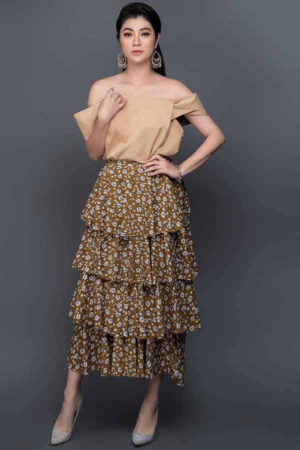 Thanh Trúc nữ tính với váy xếp ly, đi kèm phụ kiện hoa tai lạ mắt. Người đẹp Trà táo đỏ chăm chỉ cập nhật xu hướng mới, để làm tăng tính đa dạng trong tủ đồ.