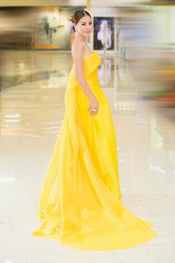 Tại buổi ra mắt dự án Ai là người thứ ba, Nam Thư nổi bật nhất thảm đỏ với váy dạ hội màu vàng. Trang phục khóe léo tôn vinh vòng một đầy đặn cùng vóc dáng thon gọn của Nam Thư.
