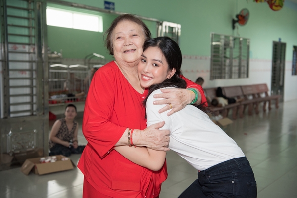 Gặp gỡ Má Mười – người cưu mang hơn 100 mảnh đời bất hạnh tại mái ấm Thiện Duyên, các người đẹp đều vô xúc động khi nghe những câu chuyện xoay quanh về họ. Đáp trả tấm lòng mà dàn hậu trao gửi, người đứng đầu mái ấm còn tặng bức tranh handmade đầy giá trị cho các vị khách trong dịp ghé thăm lần này. (Trong ảnh: Hoa hậu Tiểu Vy và Má Mười)