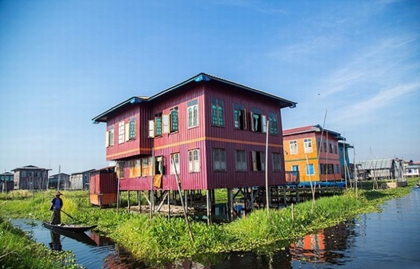 Những ngôi nhà sàn của người dân làng In Paw Khone ấn tượng với nhiều màu sắc đẹp mắt.