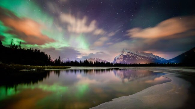 6. Banff, Canada: Banff là vườn quốc gia lâu đời nhất ở Canada. Tại đây, du khách có thể trải nghiệm các môn thể thao mùa đông, bao gồm trượt tuyết trên nền ánh sáng bắc cực quang huyền ảo.
