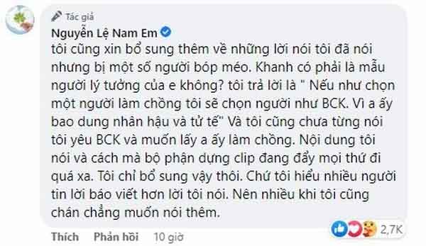 Phía dưới bình luận, Hoa khôi Đồng bằng sông Cửu Long đính chính: “Tôi cũng xin bổ sung thêm về những lời nói tôi đã nói nhưng bị một số người bóp méo. Khanh có phải là mẫu người lý tưởng của em không? Tôi trả lời là “Nếu như chọn một người làm chồng tôi sẽ chọn người như Bạch Công Khanh. Vì anh ấy bao dung nhân hậu và tử tế” Và tôi cũng chưa từng nói tôi yêu Bạch Công Khanh và muốn lấy anh ấy làm chồng. Nội dung tôi nói và cách mà bộ phận dựng clip đang đẩy mọi thứ đi quá xa. Tôi chỉ bổ sung vậy thôi. Chứ tôi hiểu nhiều người tin lời báo viết hơn lời tôi nói. Nên nhiều khi tôi cũng chán chẳng muốn nói thêm”.