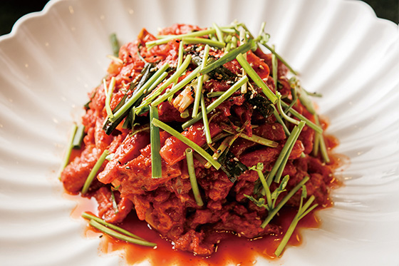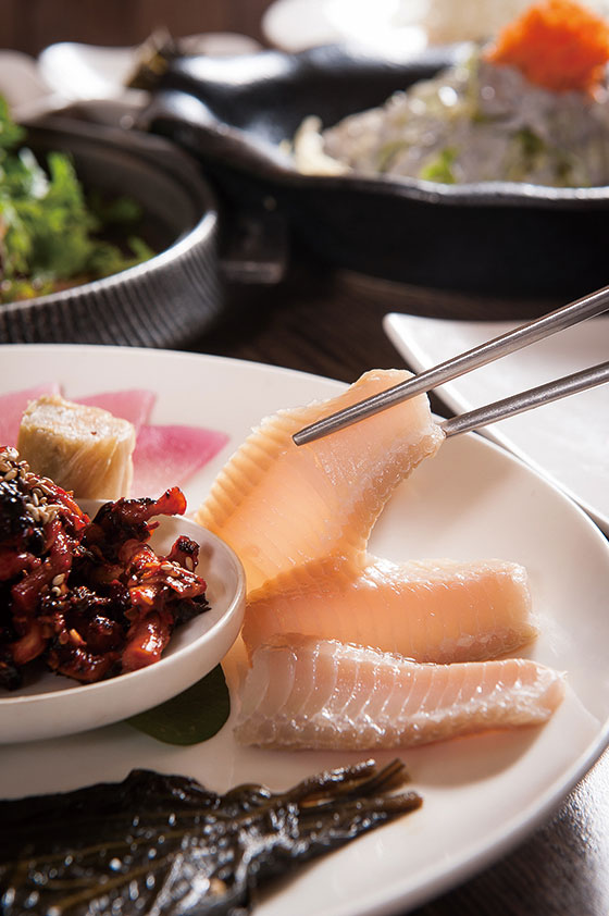 Cá đuối muối (hongeo hoe). Cá đuối muối thường được chấm với sốt ớt pha loãng với dấm hoặc ăn kèm với kimchi.