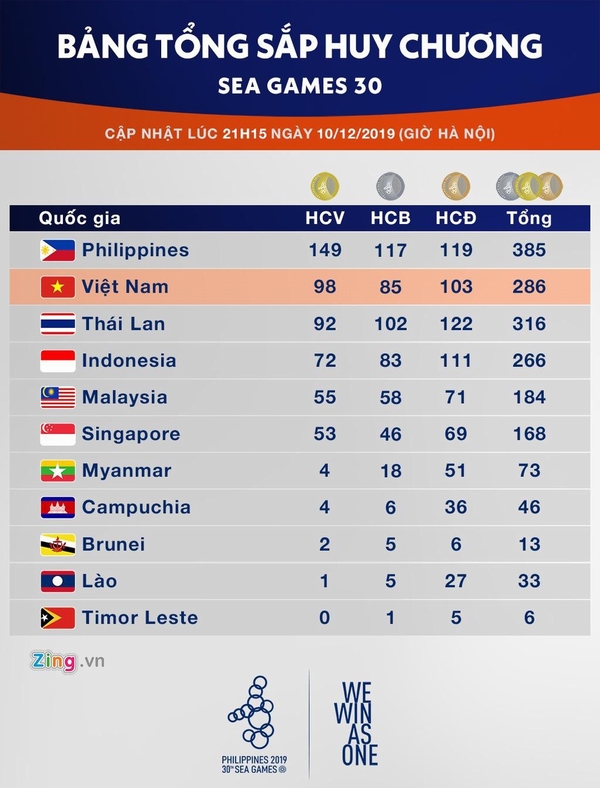 SEA Games 30 chứng kiến cuộc đua tranh hấp dẫn giữa Đoàn thể thao Việt Nam và Thái Lan cho vị trí thứ hai trên bảng tổng sắp huy chương. Hai đoàn bám đuổi nhau quyết liệt và cuối cùng, Việt Nam bỏ xa đối thủ 6 tấm huy chương vàng. 98 tấm huy chương vàng giành được, trong đó kết thúc bằng tấm huy chương vàng đến từ môn bóng đá nam, giúp Đoàn thể thao Việt Nam vững vàng ở vị trí thứ 2 trên bảng tổng sắp huy chương. Điều này gây bất ngờ lớn khi chỉ tiêu đặt ra cho Đoàn Việt Nam trước khi lên đường tranh tài là 65 huy chương vàng.