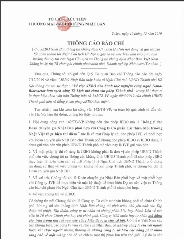 Theo đó, ngày 7/12, JEBO có thông tin tới báo chí “thấy buồn vì Chủ tịch UBND Hà Nội thông tin sai sự thật” về việc họ tiến hành thử nghiệm công nghệ Nano-Bioreactor làm sạch sông Tô Lịch mà chưa xin phép thành phố. Đơn vị nói thực hiện theo văn bản công văn số 142 ngày 9/5 của UBND thành phố nêu rõ đồng ý cho phép JEBO thực hiện. Tuy nhiên, sau khi xem lại công văn 142 và toàn bộ quá trình từ đầu khi vào Hà Nội làm thí điểm, Tổ chức Xúc tiến thương mại môi trường Nhật Bản cho hay JEBO hoàn toàn chưa xin phép thực hiện thí điểm tại sông Tô Lịch mà chỉ có Công ty JVE.