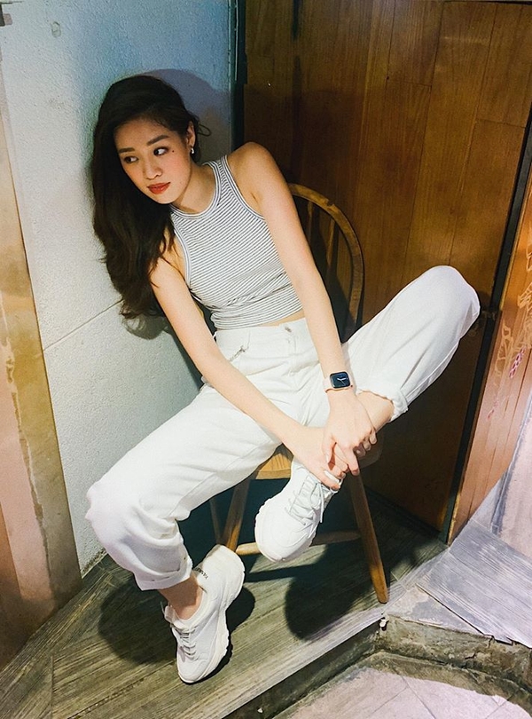 Khánh Vân rất thích chọn những thiết kế đơn giản, cô thường diện áo phông đơn giản, phối với quần jean, quần short rất năng động và trẻ trung.