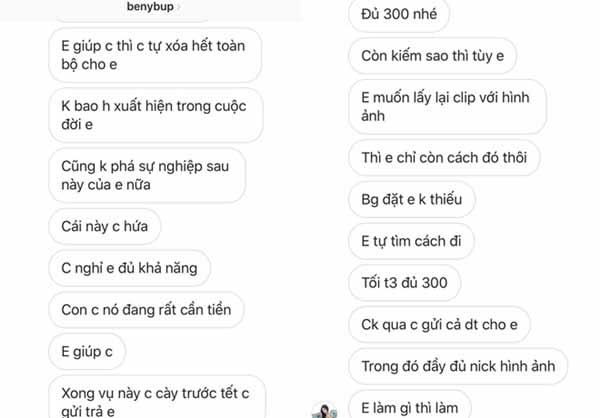 Ngân 98 mất điện thoại chứa clip nhạy cảm, bị tống tiền 300 triệu đồng – 2Dù kiên quyết với những kẻ tống tiền nhưng liên tục nhận được các tin nhắn đe dọa khiến Ngân 98 không khỏi lo lắng. Cô cho hay: “Với chiếc điện thoại bị cướp, tôi cũng quên mất tài khoản iCloud nên không thể can thiệp được. Kẻ xấu dùng tài khoản ảo nhắn tin đòi tống tiền, tôi đều chặn hết. Song, họ vẫn tạo tài khoản khác và gửi ảnh cho tôi”.