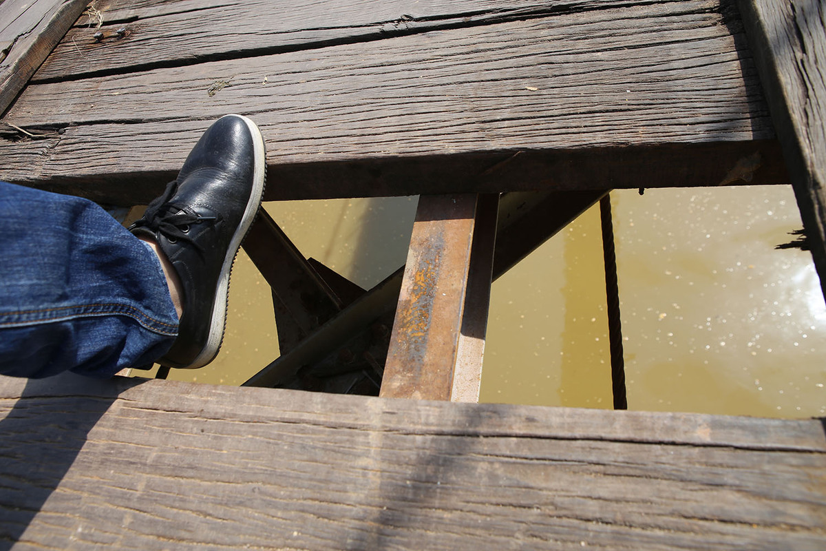 Ván trên mặt cầu nhiều tấm không còn, lộ khung sắt.